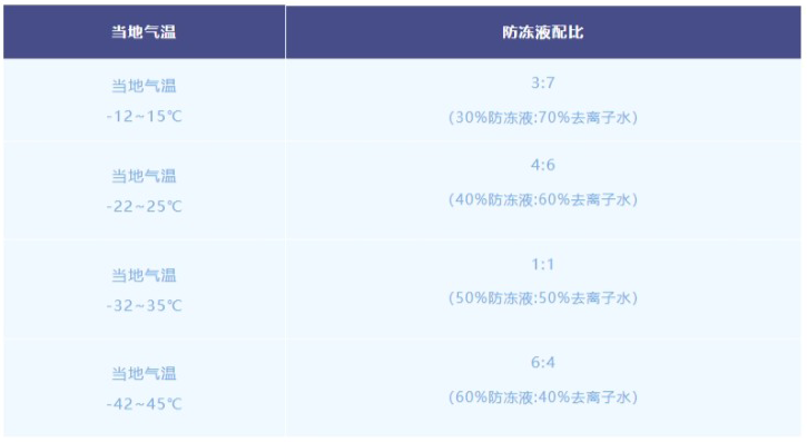 ● 使用濃度不能低于20%,不同氣溫有不同配比,請參考下表。如對配比有任何疑問,可咨詢我司售后服務(wù)熱線:400-8229-288 ;